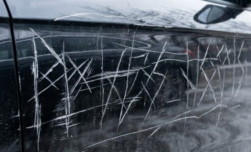 残された車に刻まれた、怨念のこもった落書き。