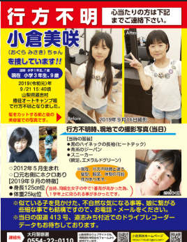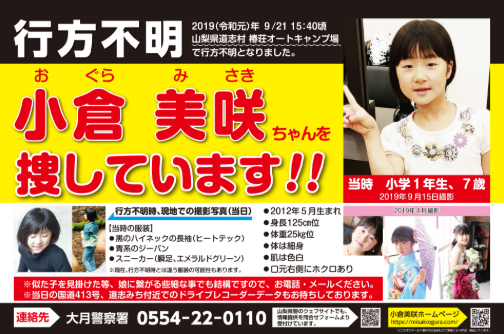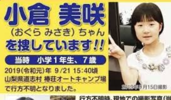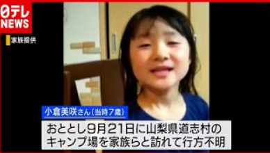 2019年(令和元年)9月21日、山梨県南都留郡道志村のキャンプ場で発生した、当時小学1年生の女児が行方不明となった事件。